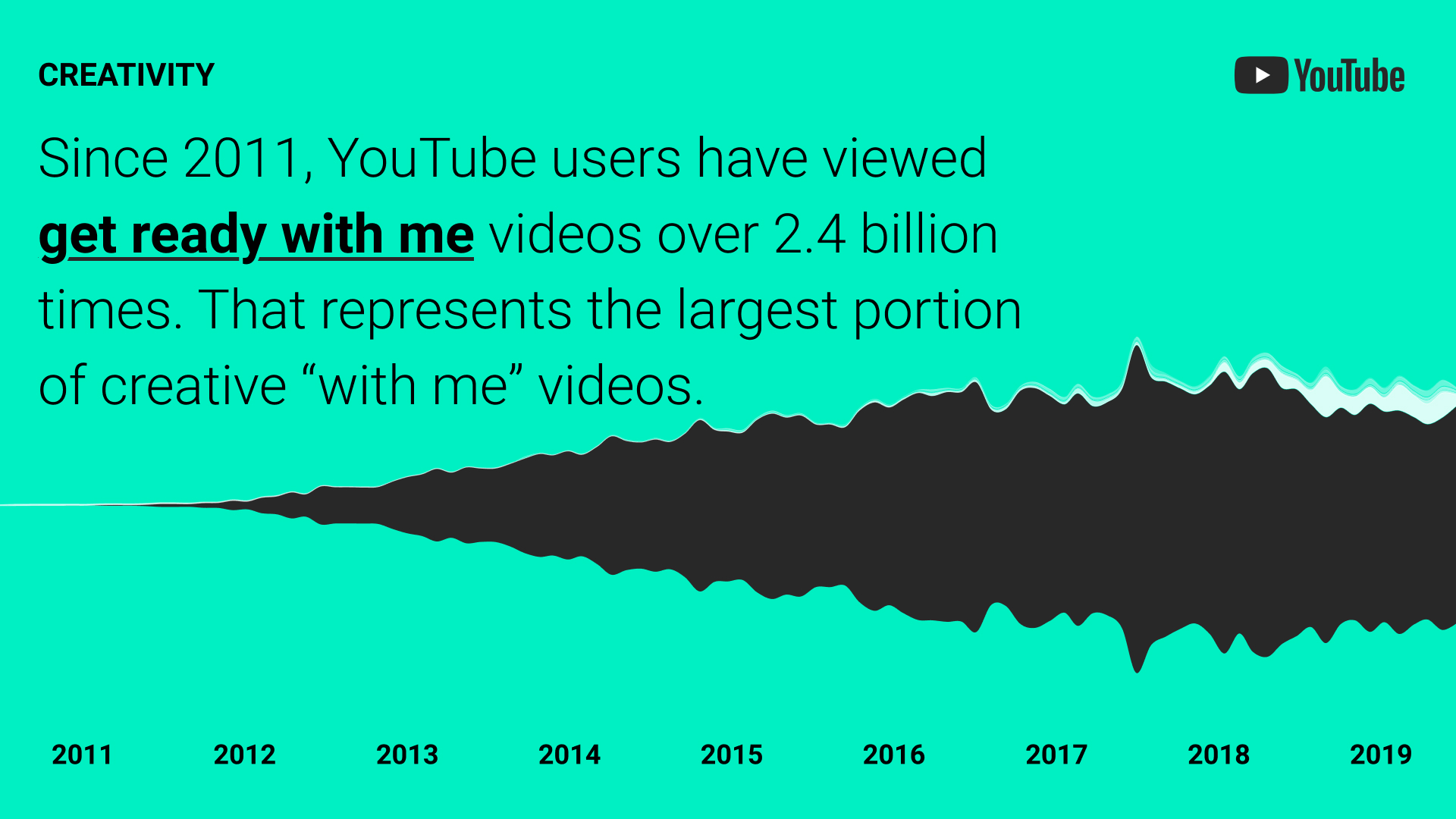 The video format further evolved in unexpected ways. “Get ready with me” videos for unique occasions began to emerge. Prom, first day of school, church -- if you can think of an activity, a “get ready with me” probably exists for it. “With me” soon grew beyond beauty, too, as creators and audiences began participating in other shared interests and activities through video. Many of these activities were things one might ordinarily do on one’s own, so these “with me” videos created group activities out of what had been lonely, individual activities.