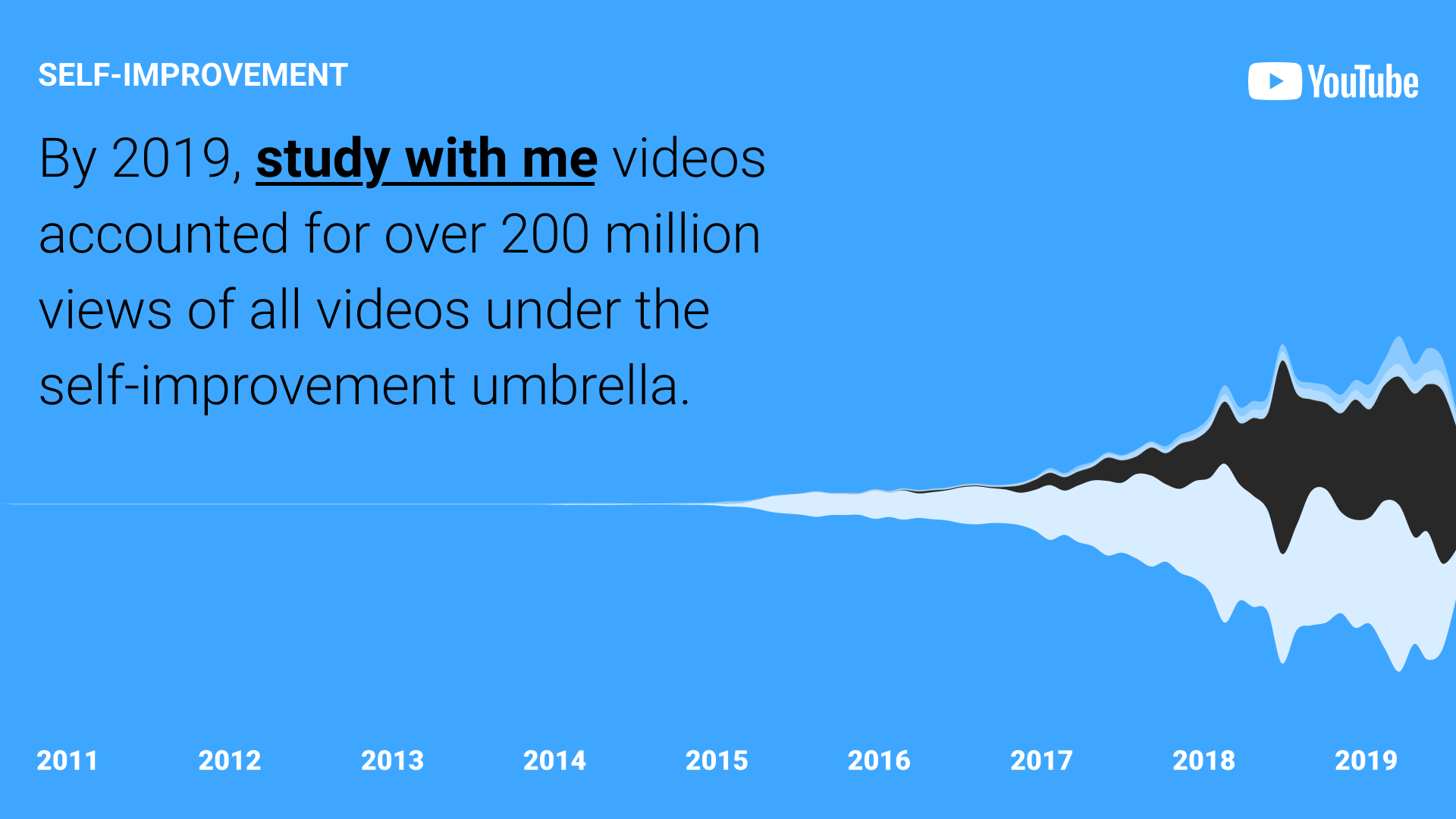 “Study with me” videos just show creators studying, and they amass large audiences whose viewership peaks during the school year and drops off during breaks. These videos provide motivation and inspiration for an activity that can be difficult to start.